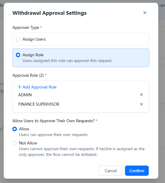 | 2.2 | Assigned Roles | Select from existing roles on the merchant platform, multiple roles supported | No | - Initiated by User A - If User A is the only user under the approved roles, the initiation fails and submission is not allowed - If there are other users under the approved roles besides User A, the initiation succeeds and all users under the approved roles except A can review - If User A is not under the approved roles, the initiation succeeds and all approvers can review |