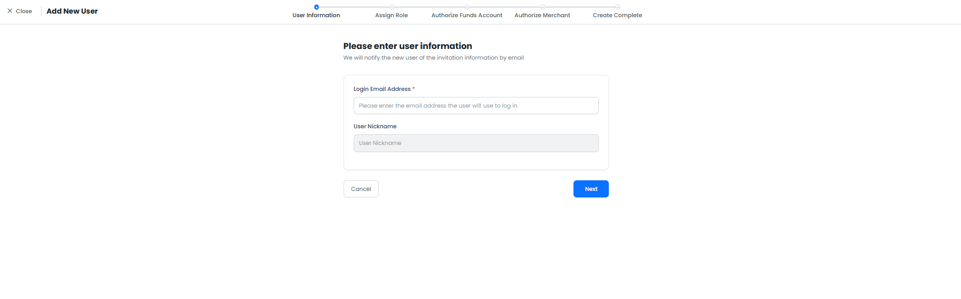 Through → , you can enter the user list to query all users under the merchant. Click to start the process (only the ADMIN has the permission to add users). After the addition is completed, the user will receive an email and complete the activation process according to the guidelines to log in and use the merchant platform.