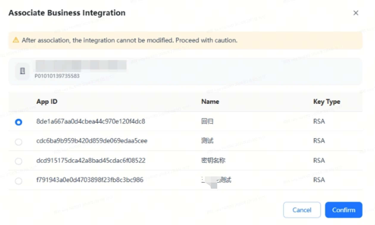 | Step 4 (Link Integration Information) | A pop-up displays all key information under the member account. Customers can link as needed (Note: Once linked, it cannot be unbound. Please proceed with caution). ![]() |